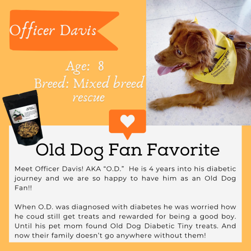 O.D's diabetic journey began 4 years ago and so did his love for Old Dog Diabetic treats. O.D's mom told us his vet team says "he's as healthy as a diabetic dog can be!"
